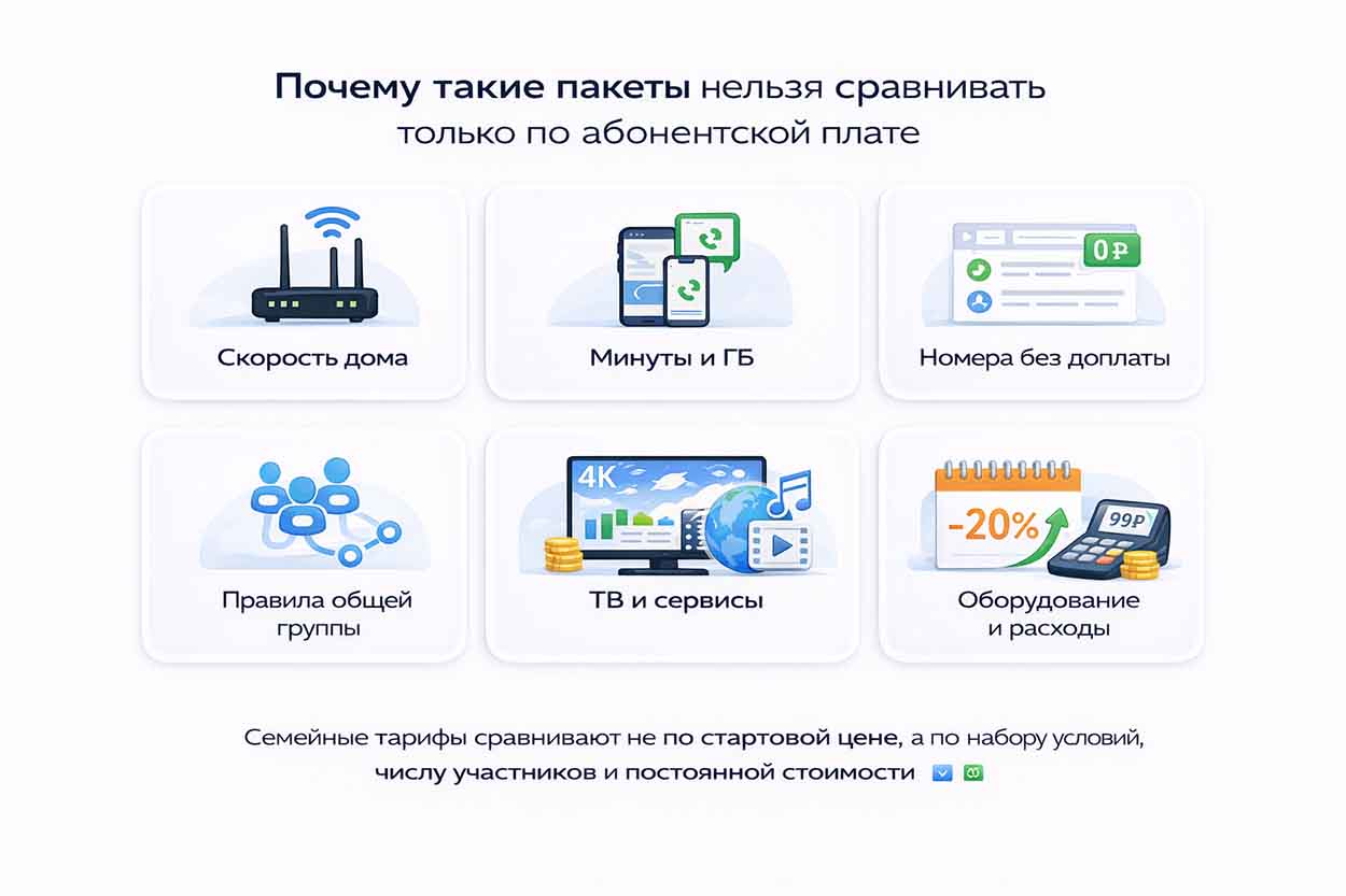 У общего пакета для семьи рекламная цена почти никогда не совпадает с итоговой стоимостью. Для выбора важно не только то, сколько он стоит в первый месяц, но и что входит в набор услуг, сколько номеров можно подключить без доплаты, есть ли ТВ, как устроена общая группа и какой будет цена после окончания акции.